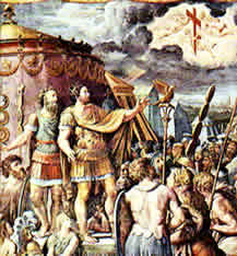Presentaba su empresa en términos propagandísticos, decía que iba a liberar a Roma del yugo tirano de Majencio, una versión que encontró muchos oídos bien dispuestos a causa de algunas medidas de Majencio que habían creado malestar. Naturalmente, no podía decir que pretendía liberar a los cristianos y que para ello venia a Italia, pues, a diferencia de lo que acaecía en Oriente, aquí no se estaba gestando persecución alguna de la comunidad de Roma. Majencio, que se debatía entre la esperanza y la duda a consecuencia de la respuesta encontrada en los libros sibilinos, planeó primero una defensa de Roma, pero luego se decidió por una lucha en campo abierto, hacia el norte del derribado puente Milvio. Por el contrario, según cuenta Lactancio, Constantino recibió en sueños la indicación de poner la señal de la cruz de Cristo en los escudos de sus soldados. Eusebio sitúa esta experiencia al comienzo de la expedición militar, cuando nos presenta a Constantino orando al Dios de su padre. Y nos dice que el césar vio a continuación en el cielo del mediodía una cruz luminosa, rodeada por la siguiente leyenda: “En este signo vencerás”. Luego, invitado a ello por una posterior aparición de Cristo, ordenó hacer un estandarte con el dibujo del crismón, y llevarlo al frente de las tropas como pendón protector.
