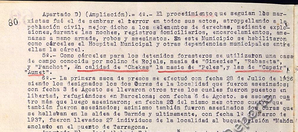La documentación revela que Tivissa fue una población muy dividida, o más bien donde los dos bandos de la guerra estuvieron activos: se dice que hubo alcaldes tradicionalistas, pero en la revolución de 1934 se proclamó allí el Estat Catalá. En las elecciones de abril de 1931 había sido amplio el triunfo republicano, destacando como más votados Luis Escoda Navarro y José María Cedó Margalef. En la Causa general no se dice de qué partido eran, pero a ambos se les considera sospechosos de la muerte de un tradicionalista, se supone que se trataba del secretario del ayuntamiento, que había ido a Tarragona para organizar el alzamiento en Tivissa. También fue un lugar de concentración y tortura de presos, al parecer de la CNT: En el pueblo llegaron a instalarse seis cárceles y tres checas y, aparte de los asesinados, hubo 27 deportados al buque Mahón, por lo que en la posguerra se registran varios desaparecidos. La costumbre, como en tantos sitios, era matar allí a los de otras poblaciones y llevar a los de Tivissa a matar en el cementerio de Reus. Cedó, reaparece en 1948 porque su esposa pide que le dejen regresar de Francia y denuncia que el usufructo de sus propiedades se los quedó el ayuntamiento de posguerra; en las respuestas se le considera responsable de los crímenes. Al ser ocupada la población por el ejército nacional, los de derechas salieron a vitorearle, mientras los de izquierdas -los que no habían huido, se entiende- se encerraban en sus casas. Como detalle anecdótico, es la primera vez que veo en la documentación de la Causa general, como despedida y repetidas veces, la expresión: “Dios, que salvó a España, le guarde". Además del religioso beatificado, mataron en Tivissa a un sacerdote, José Roca Juny, al párroco de Mora la Nueva, José Masip Gironés, y fueron a El Perelló a matar al sacerdote Rafael Fusté (casi 40 km, pasando por Ginestar, pueblo cuyos milicianos -en Tivissa también se dice que los hubo alistados en las columnas Macià, Companys, Durruti, etc- tuvieron un papel desencadenante en las primeras matanzas de Barbastro).