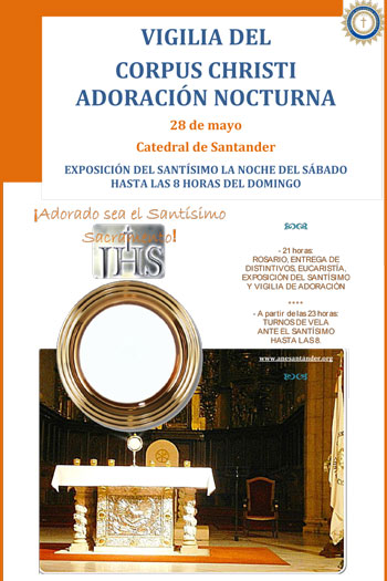 El próximo sábado 28 de mayo, víspera del Corpus Christi, la Adoración Nocturna de Santander celebrará una vigilia en esa fecha tan señalada.