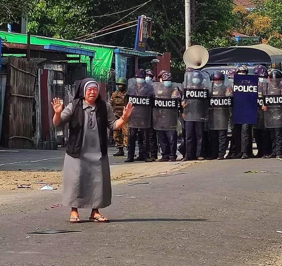 Ayer, los disturbios fueron severos en todo el país. El arzobispo de Yangón ha denunciado que la policía "está arrestando, golpeando e incluso disparando a la gente". Además, ha subido a su perfil de twitter unas imágenes impactantes: "Con lágrimas en los ojos, la Hermana Ann Nu Thawng ruega y detiene a la policía para que deje de arrestar a los manifestantes. Aproximadamente 100 de los manifestantes pudieron escapar de la policía debido a la monja".