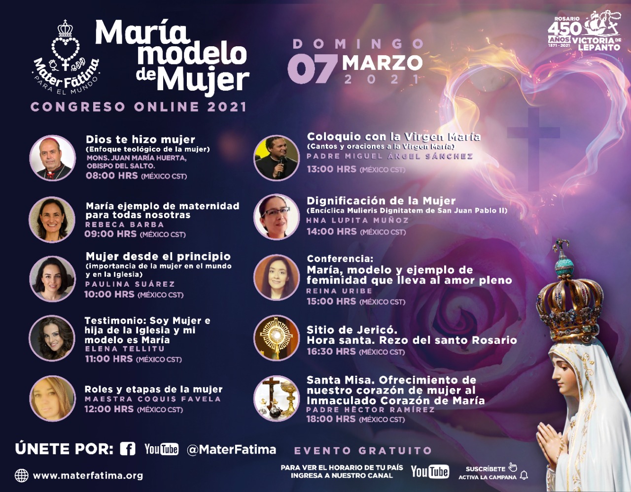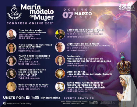 El Congreso virtual comenzará a las 8 AM y concluirá con el rezo del Sitio de Jericó a las 4:30 PM y a las 6 PM la celebración de la Santa Misa en la que se ofrecerá la misión de cada una de las mujeres participantes, al Inmaculado Corazón de María. (Horarios de México central).