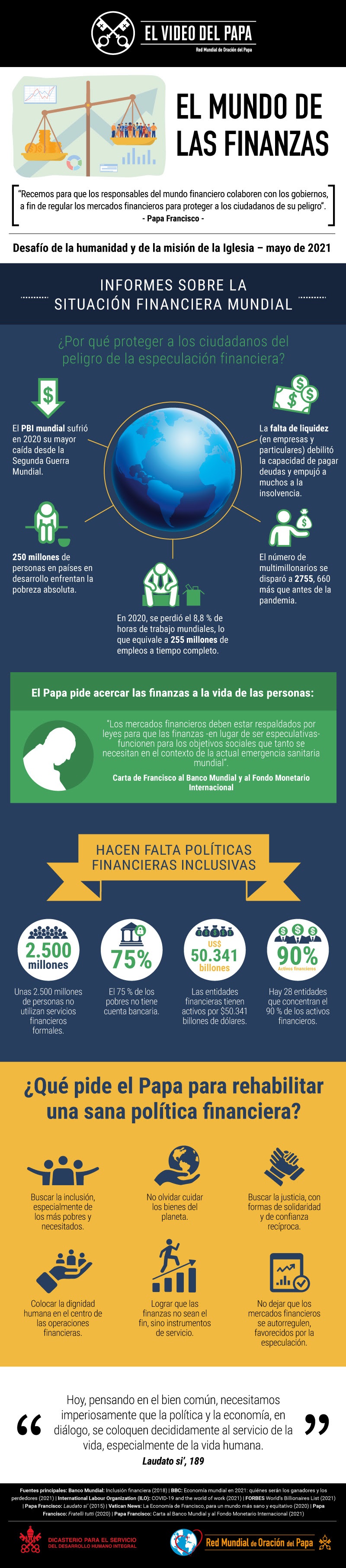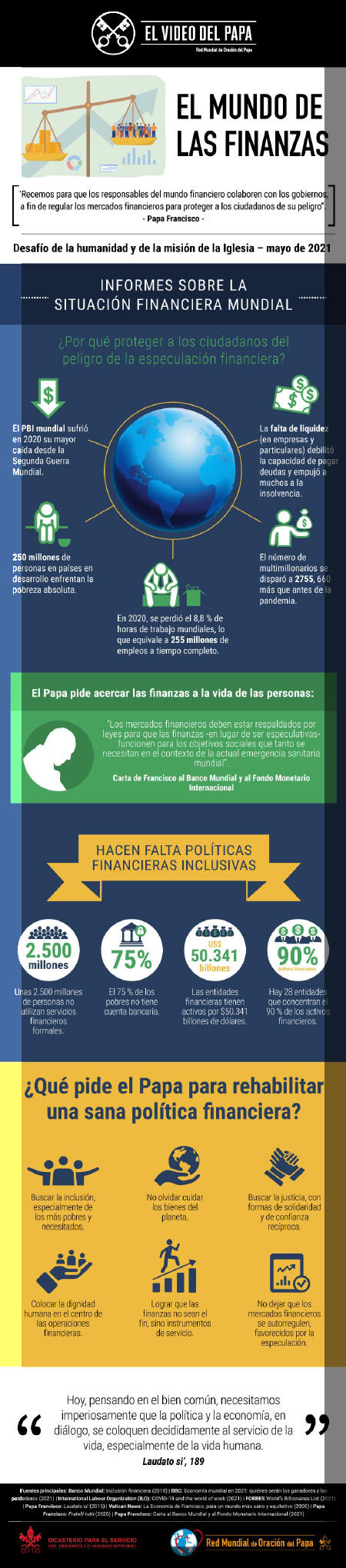 Ahora, el último vídeo del Papa el Santo Padre pide que “las finanzas sean instrumentos de servicio, instrumentos para servir a la gente y cuidar la casa común” y reza para que los responsables del mundo financiero protejan a los más necesitados. Esta edición cuenta con la colaboración del Dicasterio para el Servicio del Desarrollo Humano Integral.