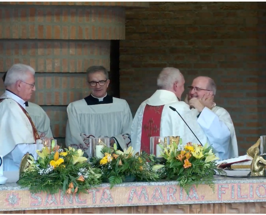Torreciudad. Abrazo entre el obispo, el nuevo rector y el rector saliente Ángel Lasheras, en la 31ª Jornada Mariana de la Familia