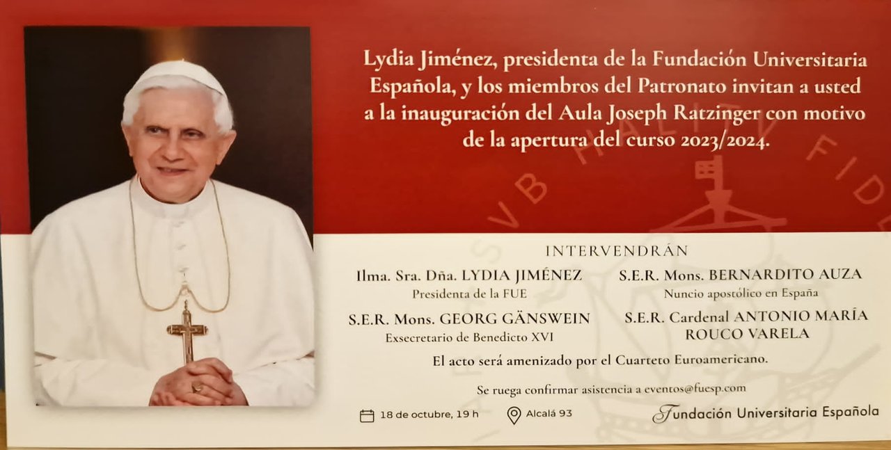 En dicho comunicado, la FUE explica que "con este acto, la Fundación conmemoraba que hace treinta años el cardenal Joseph Ratzinger presentó en nuestra sede el Nuevo Catecismo de la Iglesia Católica. Por ello, se ha reeditado la conferencia que impartió aquel día. El libro incluye, junto a las fotografías del evento, un texto introductorio de nuestra presidenta y la relación de los cursos y publicaciones de la Fundación sobre el que fue Papa y gran teólogo católico".