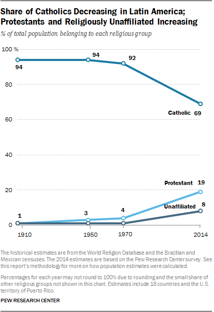 El Pew Research Center acaba de publicar (13 de noviembre de 2014) un macroestudio basado en 30.000 entrevistas presenciales entre octubre de 2013 y febrero de 2014 en todos los países de habla hispana y portuguesa de América Latina y el Caribe, con la excepción de Cuba y la inclusión de Puerto Rico y los ‘hispanics’ de USA. El término ‘protestante’ es amplio, porque incluye a todas denominaciones históricas y a los pentecostales que suponen la mitad de esta categoría, y en ese sentido uso ‘protestante’ en este post.