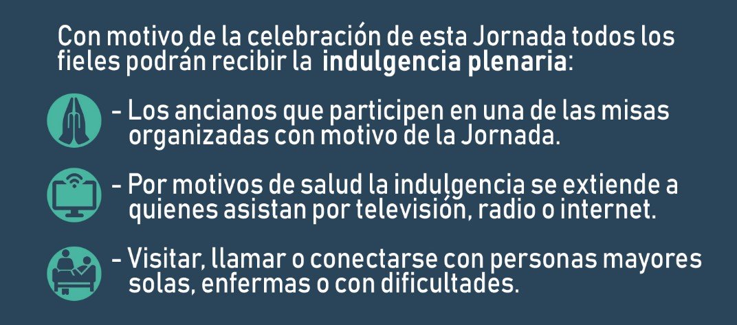 - Asimismo se concede también la “indulgencia plenaria” en este mismo día a los fieles que dediquen un tiempo adecuado a visitar presencial o virtualmente, a través de los medios de comunicación, a sus hermanos ancianos necesitados o en dificultad: como enfermos, abandonados, discapacitados, etc.