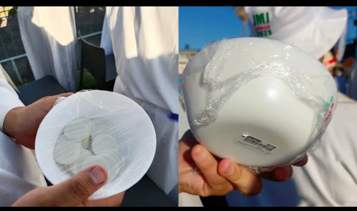Como muestra la foto, durante la misa celebrada en la JMJ de Lisboa con los jóvenes españoles, se repartió la comunión en boles de plástico en lugar de vasos sagrados.
