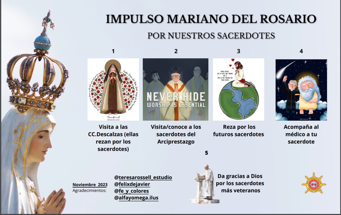 El P. Felio Vilarrubias Darna, promotor de este "Impulso mariano de Oración por los sacerdotes" explica a Religión Confidencial: "Tres iniciativas y un único propósito: rosarios misioneros para países perseguidos, un calendario anual ilustrado en Redes Sociales y la Visita de la Imagen Peregrina de Fátima es la tríada que promueve Impulso Mariano de Oración por los Sacerdotes, con su logo propio lleno de simbolismo".