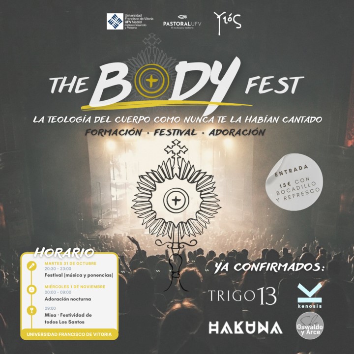 La Universidad Francisco de Vitoria (UFV) organiza "The Body Fest: La Teología del Cuerpo como nunca antes la habías experimentado". Este evento tiene como objetivo principal ayudar a las personas, ya sean jóvenes, matrimonios, familias o solteros, a comprender la belleza y el profundo significado de sus cuerpos, su identidad como amados hijos de Dios y su llamado a la comunión, lo que se traduce en una vida más significativa y armoniosa en todas sus relaciones.