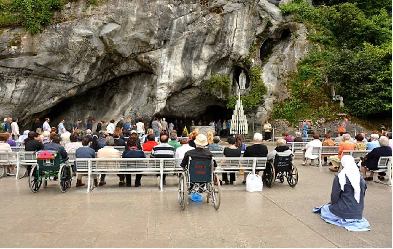 Peregrinos rezando ante la Gruta de Nuestra Señora de Lourdes.