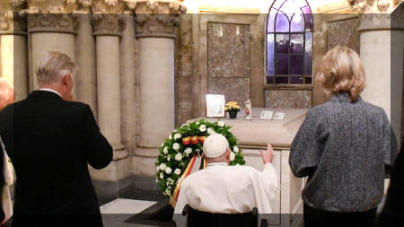 El Papa con los reyes de Bélgica frente a la tumba de Balduino.