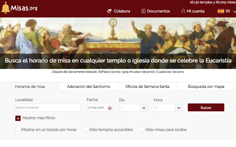 El conocido buscador de templos y horarios de misa, Misas.org, ya dispone de un mapa desde el que hacer las búsquedas. Por defecto localiza los templos que tienen misa ese día, pero se pueden establecer filtros para indicar el día deseado o incluso la franja horaria en la que se desea buscar.
