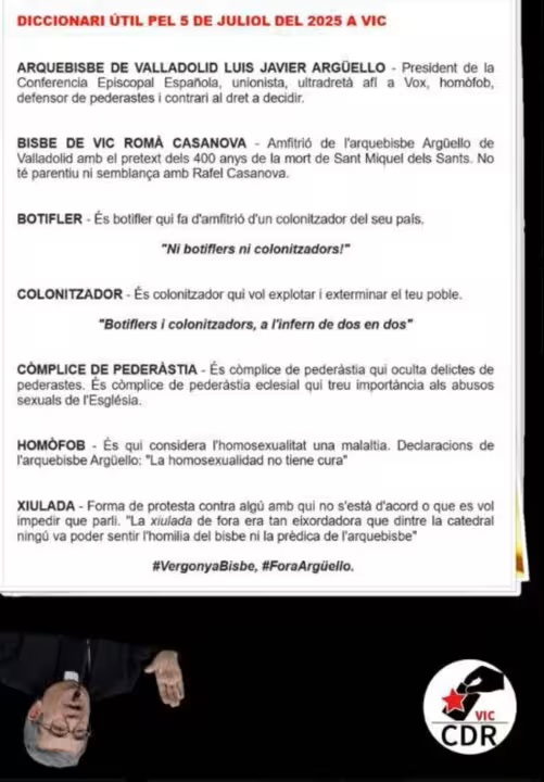 "Diccionario útil para el 5 de julio de 2025 en Vic. Arzobispo de Valladolid Luis Javier Argüello, presidente de la Conferencia Episcopal Española, unionista, ultraderechista afín a Vox, homófobo, defensor de pederastas y contrario al derecho a decidir.