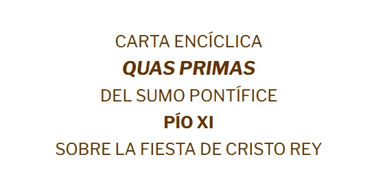 El papa Pío XI publicó el 11 de diciembre de 1925 la encíclica Quas Primas. Esta era la sexta encíclica del citado pontífice. En ella se abordaba el tema de la realeza de Cristo y se instauraba la fiesta de Cristo Rey.