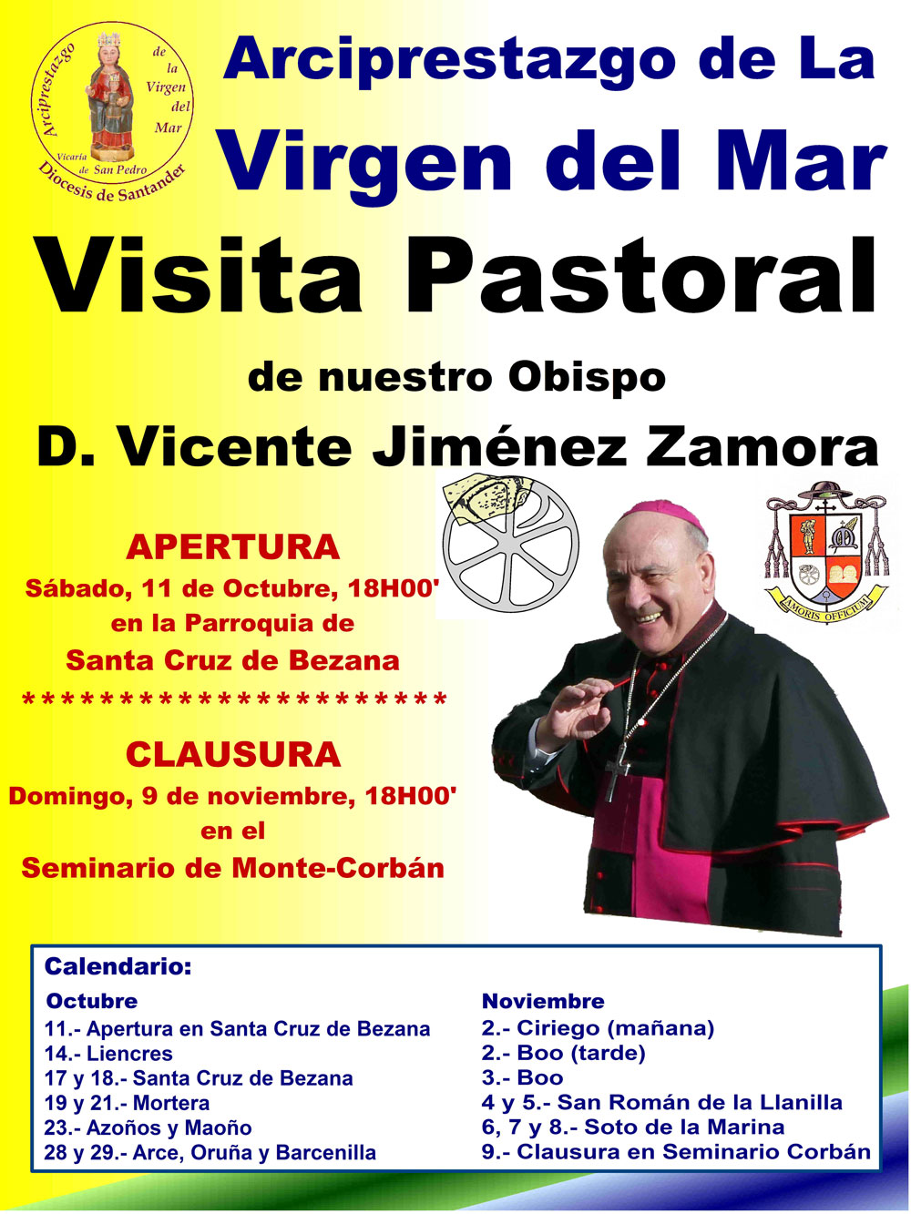 Mons. Jiménez, que el martes 14 ya visitó Liencres, visitará hasta el 9 de noviembre los 11 pueblos que forman el arciprestazgo de la Virgen del Mar con el siguiente calendario: Mortera (19 y 21 octubre); Azoños y Maoño (23); Arce, Oruña y Barcenilla (28 y 29).
